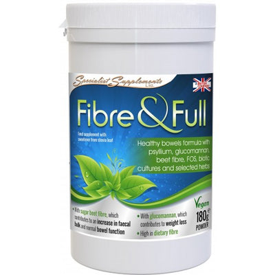 Fibre & Full is a vegan-suitable, high in dietary fibre, bulk and weight loss support combination supplement, with psyllium husks, sugar beet fibre, bacteria, prebiotics (FOS), glucomannan fibre, L-Glutamine and herbs (fennel seed, peppermint leaf and ginger root).