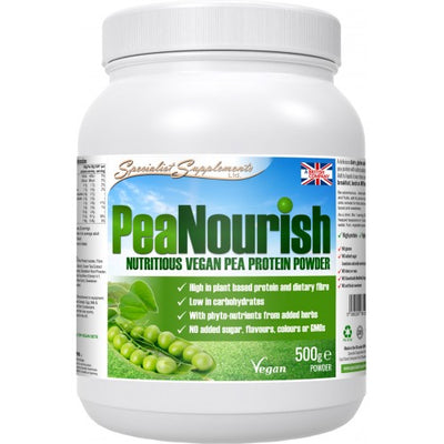 PeaNourish is a high quality, high in protein and dietary fibre, vegan pea protein powder (from snap peas), blended with a range of other foods and herbs for added nutritional value. These include chicory root extract, green tea extract, dandelion root powder, spirulina powder and acai berry extract.